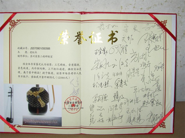 二胡制作大師丁家彭先生1949年出生樂器世家,17歲隨其祖父學琴藝,并深得精髓,其聰穎好學,悉心鉆研與 探求二胡制作,博得同行的欽佩贊許,更得了許多知名演奏家的稱贊,充分認識到二胡制作每個環節,都對二胡制作都有影響力,因此對二胡的選材,選料,蟒皮都十分嚴格,二胡整體穩定性良好,環境干擾影響極小。